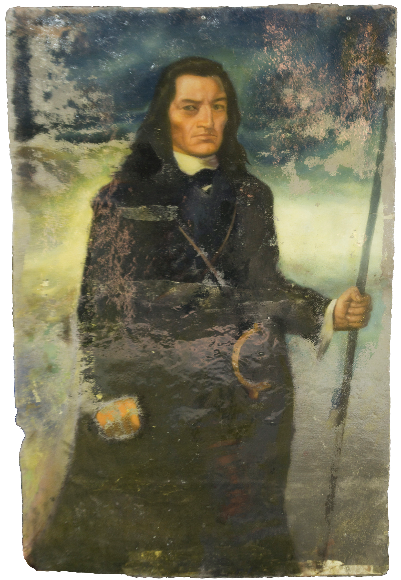 “José de San Martín o un criollo independentista”, 2019. Pintura desprendida, 120 x 80 cm c/u.“Túpac Amaru o un indígena revolucionario”, 2019. Pintura desprendida, 120 x 80 cm.“Felipe IV de España o un rey blanco”, 2019. Pintura desprendida, 120 x 80 cm.Prueba con luz (opción de montaje)“Simón Bolívar o un criollo independentista”, 2019. Pintura desprendida, 120 x 80 cm c/u.